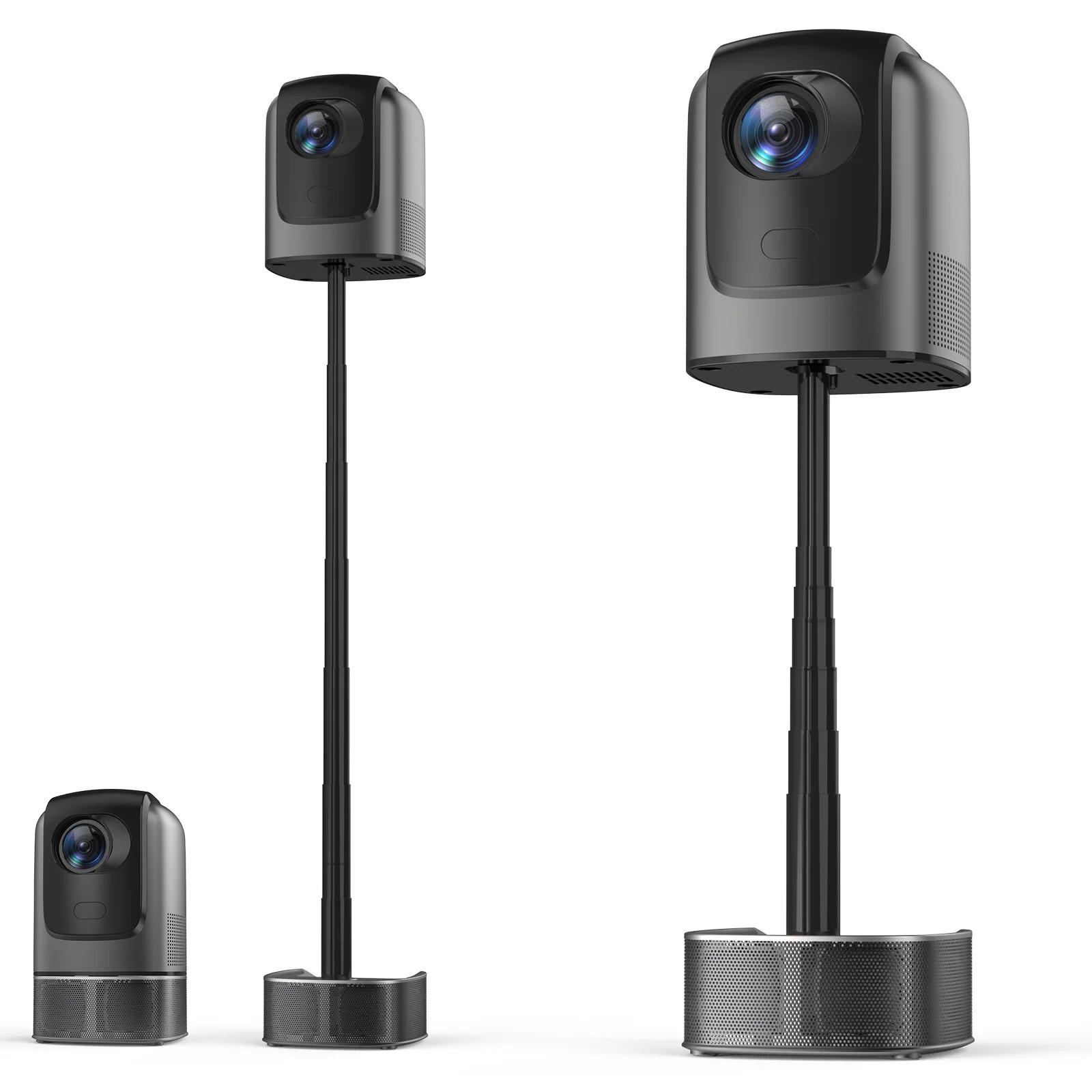 Soporte telescópico ajustable en altura, que facilita proyectar hacia adelante o sobre superficies elevadas.